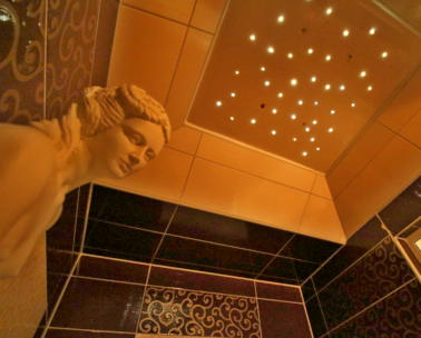 Dieses Gesundheitsbad der Antike, wurde von den Römern „Tepidarium“ genannt. Der Regenerationsprozess beginnt zu wirken, sobald Sie sich durch die sanfte Wärme der Strahlungswärme wohlig warm fühlen.  Temperatur ca. 35 ° C.,  Anwendungsdauer bis 20 Minuten. Unser Zauberkugel wird Ihre positive Lebensenergie wecken. Hier können Sie Kraft schöpfen und  die Seele auf Reisen schicken.   Tepidarium Nach einem entspannenden Saunagang, finden Sie ein Abkühlerlebnis der besonderen Art in unserer großen Erlebnisdusche. Nirgends wird die natürliche Kraft und Lebendigkeit des Wassers besser erlebbar sein.  Wählen sie zwischen Wasserfall, BigRain oder Nebel mit minzig kühlem Duft. Für zusätzliche Atmosphäre, bei dieser besonderen Art der Abkühlung, sorgen dezente Lichtspiele, Meeresrauschen und Vogelgezwitscher für eine besondere Atmosphäre. Die Erlebnisdusche Der Eisbrunnen spricht gleichzeitig mehrere Sinne an. Die positiven Wirkungen eines Sauna- oder Dampfbades werden verstärkt und die Anwendung  als ein besonderes Erlebnis empfunden.  Erfrischend kaltes Crash-Eis aus unserem Eisbrunnen nehmen Sie als weitere prickelnde Zeremonie in Ihre Hände und reiben den ganzen Körper ein. Dieses wirkt kühlend, belebend und regt das Herzkreislaufsystem an.  Der Eisbrunnen Das Aroma-Dampfbad ist mehr als ein Raum  voller Dampf; ein farbiger Sternenhimmel bringt Magie in den Raum. Das Dampfbad ist am Anfang der Saunagänge zu empfehlen, die hohe Luftfeuchtigkeit sorgt für ein äußerst erholsames Klima.  Temperatur ca. 45 ° C.,  Anwendungsdauer ca. 15 - 20 Min.  Das Aroma-Dampfbad Unser Trinbrunnen ist wichtig!  Er ist ein gesunder, kalorienfreier Durstlöscher, der Ihnen dabei hilft, die beim Schwitzen verlorenen Mineralien zu ersetzen. Er erfrischt und steigert die Leistungsfähigkeit..    Der Trinkbrunnen Wer besonders die trockene Hitze (85 – 90°C.) bei einer Luftfeuchtigkeit von (5 – 15 %), ohne Aufguss liebt, findet hier die richtige Anwendungstemperatur. Einen Kräuteraufguss, finden Sie in der Kristallsauna. Anwendungsdauer ca. 15 - 20 Min.  Die heiße Sauna